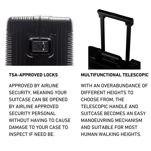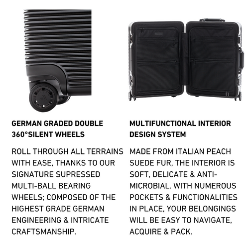 Crafted with precision and care, our Signature Cases set a new standard in global travel. Featuring a durable German polycarbonate aero-grade shell, aluminum framing, reinforced protective corner plates, a multi-level adjustable telescoping handle with enhanced security, and a much larger, more durable wheel housing that composes 360-degree German Run-Silent shock-absorbing wheels, they deliver an exceptional travel experience. Inside, a thoughtfully designed interior with clever organizational components makes packing and unpacking effortless.